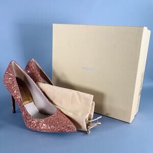 MICHAEL KORS COLLECTOIN pumps in a copper glitter covered leather featuring a pointed toe, stiletto heel, and slip on closure. Made in Italy.