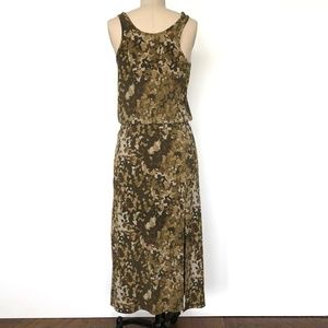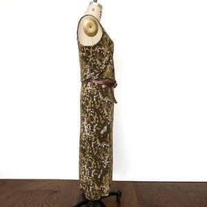 Camo always comes and goes. It's still here! Timeless and comfy knit dress. It is a blouson bodice with elastic waist and comes with belt. The length is below calves and above the ankle depending on how tall you are. I wore it mostly with wedge sandals.