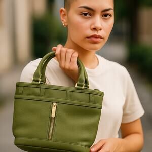 Stylish green crossbody with Pebbled leather – soft, textured, and durable. Front and top zippers, as well as interior zip pocket, and adjustable/removable strap. This is SO CUTE!