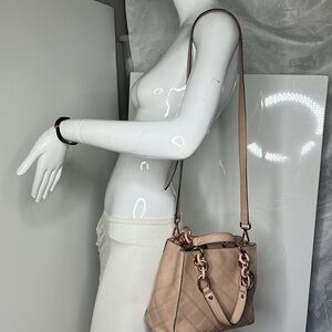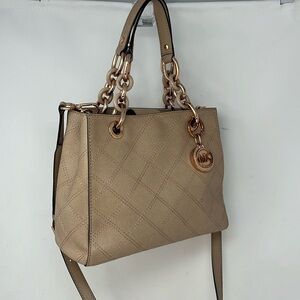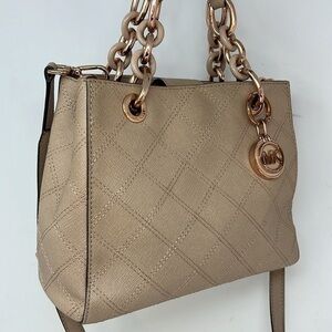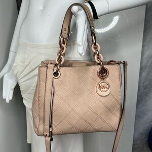 This is a beautiful MICHAEL KORS Cynthia Small Saffiano Leather Beige Satchel Crossbody Shoulder Bag. Rosegold hardware. All logo’d. 9.5”W x 7.5”H x 4”D with 6” handles and a detachable crossbody strap. Some of the rosegold hardware does show some scratches and wear. Double compliment separate by a full zip compartment. Multiple slip in and zipper compartments. Key fob. No odors. Minor scuffs. No tears.