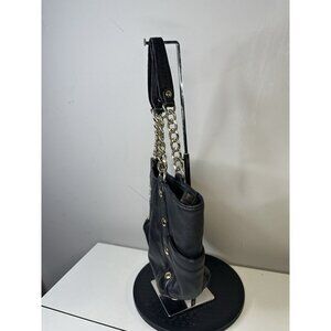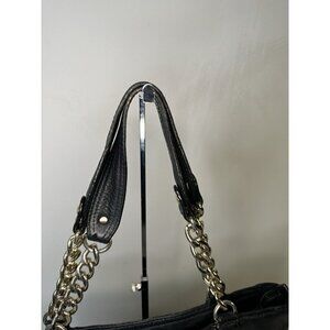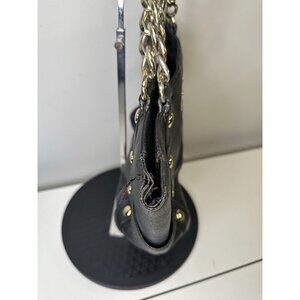 The Michael Kors Delancy Tote Satchel Shoulder Bag is a stylish and versatile accessory for women. Made from black leather with studded accents, it features a zip closure, gold hardware, and a pebbled finish. The medium-sized bag includes inner pockets, a chain strap, and a fabric lining, making it practical for everyday use. The classic black exterior color and black leather strap add a touch of sophistication to any outfit, making it a must-have piece from the Michael Kors Delancy collection.
