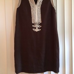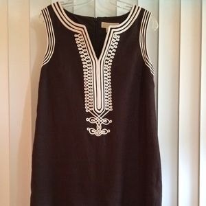 Sleeveless Michael Kors short dress.....100% linen, fully lined with 100% cotton.....Decorative white soutache trim around neck, arms and down front.....