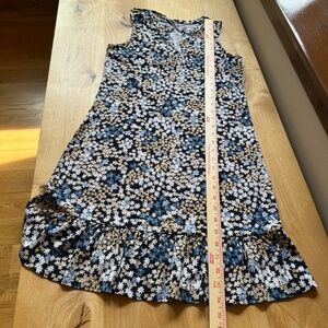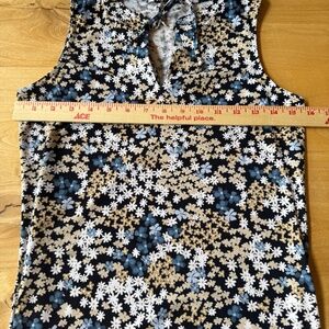 Size XS, 95% polyester, 5% elastane, jersey stretch, sleeveless, pull on, tie front, ditzy floral print, ruffle edge hem, brand emblem on back nape.