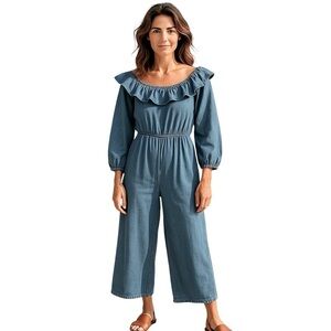 MICHAEL KORS Denim Chambray RUFFLE ON/OFF SHOULDER JUMPSUIT Small …Boho casual