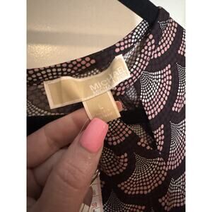The product is a stylish Michael Kors dress in a geometric pattern, featuring a mix of pink, black, and white colors. The dress has long sleeves and showcases a mini or A-line style with a short dress length. This colorful dress is designed for women and fits in size Large, making it a versatile and chic addition to any wardrobe.