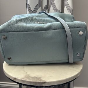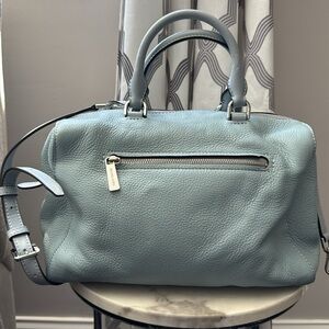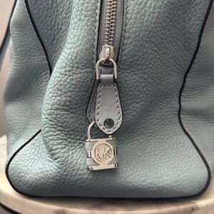 MICHAEL KORS Dusty Blue Kirby Satchel leather bag convertible satchel/handbag with dual handles and detachable long cross body strap. Silver toned hardware. Zipper closure, exterior zipper pocket, interior compartment has one zipper pocket and four slip pockets, interior lined with MK insignia. Measures approx 8 x 12 in.