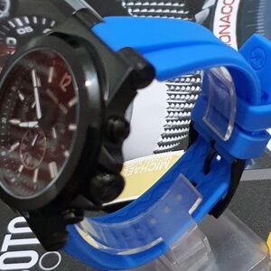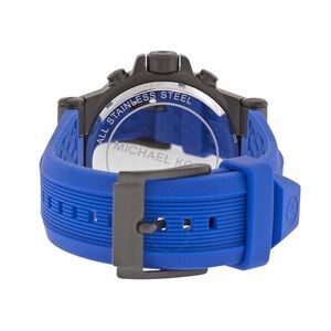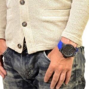 • Black ion-plated stainless steel case with a blue silicone strap.
