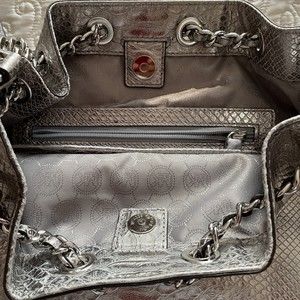 Features great silver metal link chain hardware.