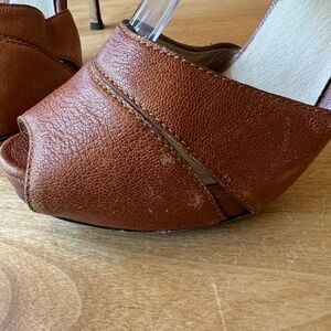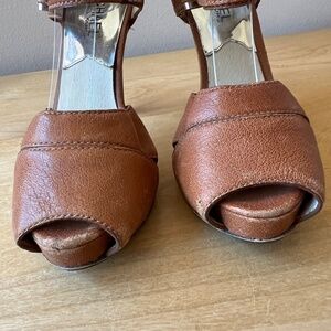 Womens size 5M, tan, color is called Luggage, heel, open toe, peep toe, studded detail, strappy.