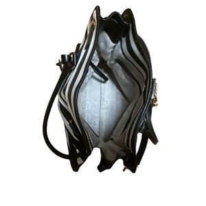 Great condition Michael Kors black and white striped large capacity shoulder bag. 13” across front 12” high and 6” front of purse to back. There is absolutely nothing wrong with this purse, very, very gently used it really is in like new condition. Pictures show lock on the front of the purse, the little leather piece hanging on the back has the key. Great deal and would make a great gift.