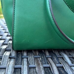 This simple Hamilton tote from MICHAEL Michael Kors has been crafted from a beautiful tanned leather in a brilliant emerald green shade and decorated with an engraved padlock on the front, and leather luggage tag. The bag has two handles, a shoulder strap, and a spacious nylon interior in a signature print. Interior features 4 slip pockets, and a single zippered pocket. Interior is really clean but does have one stain in bottom corner. Shoulder strap is adjustable with a buckle and 5 holes, and measures 39 1/2” long when buckled in middle hole. The middle of strap has 2 scuffs. Zip top closure.