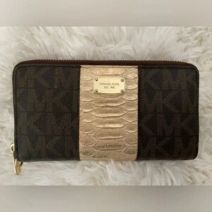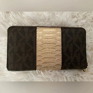 MICHAEL KORS Hamilton Zip Wallet Signature Brown Saffiano With Gold Croc Trim