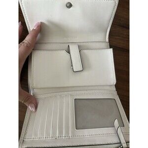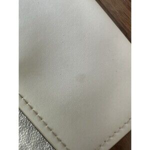 The Michael Kors Jet Set Charm Large Flap Phone Wristlet in Optic/Allum (white) color is a stylish and practical accessory for women on the go. Made from leather/PVC, this wristlet features a signature logo pattern and a jet set charm character. With a size of L, it includes accents like a strap, zipper, and logo details. The white color adds a chic touch to the overall design, making it a versatile accessory for everyday use. The item length of 7-1/4" and width of 4-3/4" H provide ample space for credit cards and cash while maintaining a compact design.