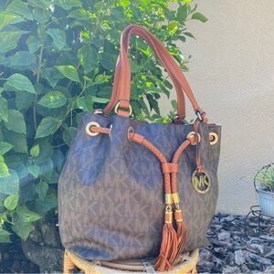 MICHAEL KORS JET SET LARGE GATHERED TOTE SIGNATURE BROWN EUC