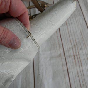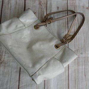 VERY USED AND LOVED CONDITION, MICHAEL KORS LOGO JET SET WHITE PATENT LEATHER TOTE WITH TAN LEATHER TRIM AND HANDLES. BAG MEASURES 16"ACROSS TOP, 12"ACROSS BOTTOM BY 11"TALL BY 6"DEEP. THERE ARE A FEW STAINS TO THE WHITE PATENT LEATHER AS SHOWN, SOME SMALL AREAS OF CRACKING ALONG THE TOP PIPING AND SIDE POCKET PIPING AS SHOWN. HANDLES ARE IN DECENT SHAPE, INSIDE IS CLEAN. STILL LOTS OF LIFE LEFT.