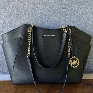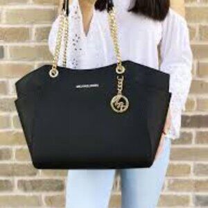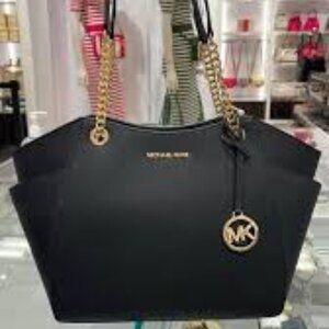 MICHAEL KORS JET SET TRAVEL LARGE CHAIN SHOULDER TOTE BAG MK BLACK LEATHER GOLD
