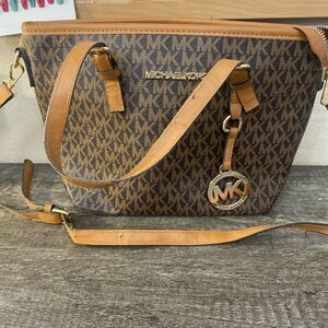 The Michael Kors Jet Set Travel XS Carryall Tote Shoulder Bag in Glitter Gold/Brown is a small rectangular shaped shoulder bag with a zip closure and gold toned hardware accents. It features a brown double handle/strap with a 5-inch handle drop and a long adjustable strap for convenience. The bag is adorned with the signature Michael Kors logo and has a satin exterior in a brown/gold color. Perfect for various occasions including travel, weddings, parties, casual outings, formal events, workwear, and business meetings, this stylish tote is a versatile accessory for any designer lover.