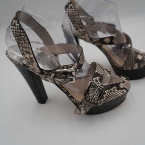 Pre-owned without the box Michael Kors Josephine snakeskin strappy platform sandals size 9.5. Chic snakeskin pattern. Strappy design with buckle. Perfect for any occasion.