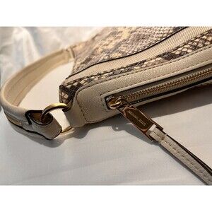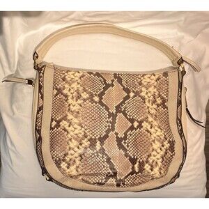 Used once- Michael Kors Julia Convertible Tote in Ecru Python Snake Embossed Leather is a stylish and versatile accessory for women. This tote features a zip and snap closure, a spacious interior, and a leather handle/strap for easy carrying. The sleek design of the bag, along with the embossed snake motif, adds a touch of sophistication to any outfit. This bag is in great condition with no marks or flaws. Very clean.