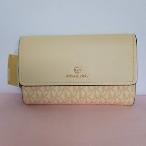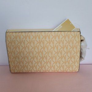 BRAND NEW WITH TAGS. Buttermilk color. A large sized trifold flap-over wristlet/wallet with snap-closure with plenty of pockets to keep your essentials organized is perfect for on-the-go lifestyle. Crafted of colorblocked Signature logo Polyvinyl chloride/ PVC. Features an ID window, a Tech-friendly pocket, a large zip-pocket plus more. It comes with a detachable MK Charm logo strap to carry as a wristlet or inside a larger bag.
