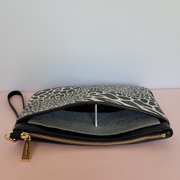 BRAND NEW WITH TAGS. Black multi-color. A medium size semi-structured Wristlet/Pouch with a top-zip closure to carry your essentials secure. It can be used inside a larger bag, as a clutch, a wristlet, a cosmetic bag and/or to store/carry travel documents, etc. Crafted of cotton jacquard signature logo stripe and mixed animal pattern. Features a back-slip pocket for added storage and convenience. It comes with a detachable wrist strap.