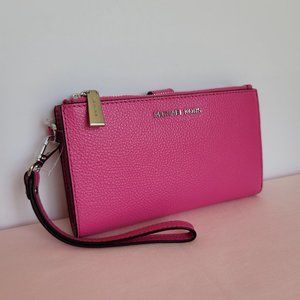 BRAND NEW WITH TAGS. Cerise color. A large sized double-zip wristlet with tab-snap closure with plenty of pockets to keep your essentials organized. Crafted of pebbled leather. Features an ID window, a Tech-friendly pocket, 2 large zip-pockets plus more. It comes with a detachable strap to carry as a wristlet or inside a larger bag.