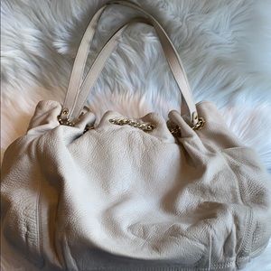 A metallic chain creates the slightly gathered silhouette of a sophisticated tote fashioned from rich, pebbled leather.