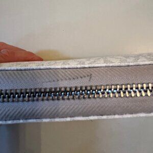 MICHAEL KORS Jet Set Travel Large Wallet in Signature print. Silver tone hardware. Off-white, Gray logo. Quarter Zip wallet. Gently pre-owned. Last two photos show one ink mark by zipper. Several interior slots for credit cards, driver's license, Middle interior pocket with zippered closure. Smoke free home. Offers Welcome!