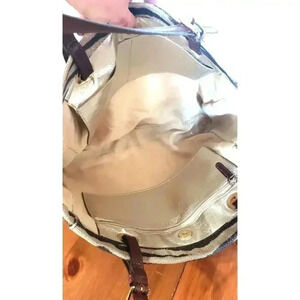 this bag is a rescue. The metallic inside was peeling so I removed it. has a good clean inside lining now. see pics a few pockets can peel as well. missing logo madalion on the front. price reflects these flaws. otherwise in perfect shape magnetic snap closure great travel bag perfect for fall