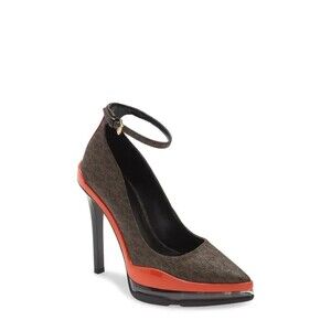Make a bold statement with these iconic MICHAEL KORS heels! They feature the signature brown logo print, a sleek pointed toe, and a striking orange lacquer trim over a unique clear acrylic/bubble platform sole. The high black stiletto heel and adjustable ankle strap offer a secure, show-stopping look. Perfect for turning heads at a party, date night, or fashion event. Shoe has some wear and tear see last 4 pics for further details.
