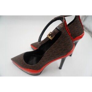 Pre-owned without tags or box MICHAEL KORS Keke Signature Brown Logo Pump Platform Heel Ankle Strap Size 9.5 M.