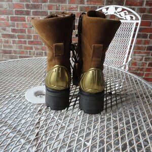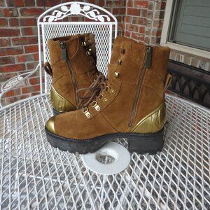 MICHAEL KORS "Khloe" Brown Suede Chunky Combat Boots with Gold Trim Size 7.5
