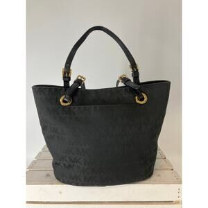 MICHAEL KORS, LARGE BLACK SIGNATURE PRINT CANVAS SHOULDER BAG