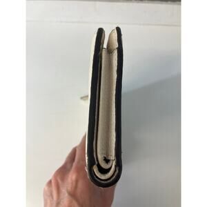 TWO DOUBLE ZIP POCKETS AT THE TOP OF WALLET. EXTERIOR ZIPPER TRIM HAS SOME STAINS (SEE PHOTOS) BOTH ZIPPERS ARE FUNCTIONAL.