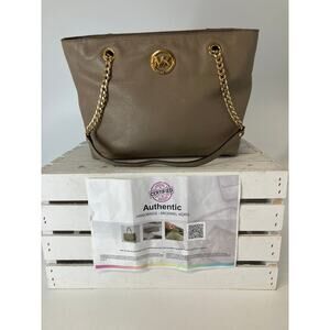 MICHAEL KORS, LARGE TAUPE, GRAY PEBBLED LEATHER SHOULDER BAG