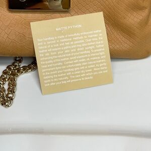 Hand clutch bag with concealed golden chain and python print leather (matt). Fabric interior and leather credit card holder insert and internal zip pocket.