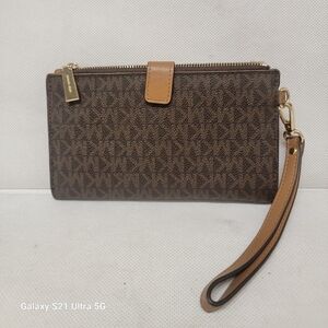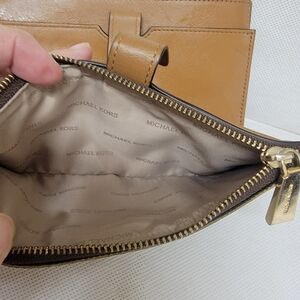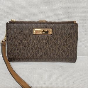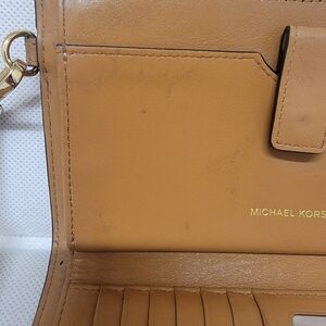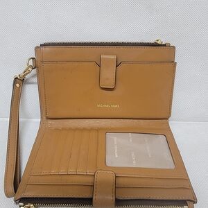 Michael Kors leather wallet/clutch. There is 2 zippered pockets, a checkbook placement, 6 slide pockets, a driver's license pocket and 2 paper money slides. There is a snap closure. The wallet is in great condition. Please see all pictures.