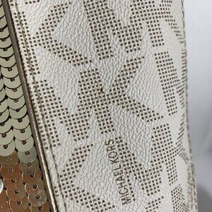 Elevate your style with the MICHAEL KORS Large Shopper Tote. This elegant beige and gold sequin striped purse is perfect for any occasion, featuring a chic charm.