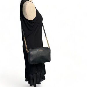 The Michael Kors Jet Set East West crossbody is a small streamlined bag that looks put together and luxe. Featuring a textured crossgrain black leather exterior with gleaming gold hardware and partial chain strap, this bag is ready for work or play. The crossbody strap is adjustable. The bag has a top zippered closure and 2 slip pockets inside. The lining is MK logo jacquard black fabric which is easy to wipe clean. Excellent preowned condition with no visible sign of wear.
