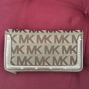 MICHAEL KORS Logo Wallet. Fabric upper. 7.5" x 4". 12 slots. Coin holder. Normal wear. Looks exactly as it is on the pic. Great condition.