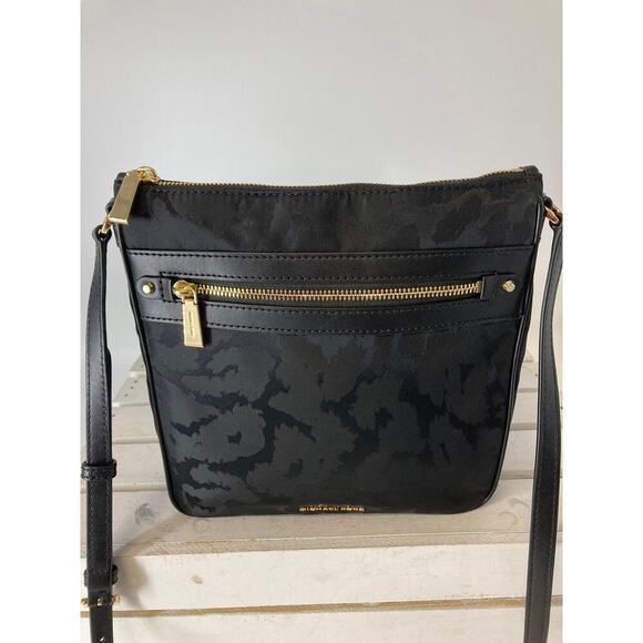 MICHAEL KORS, MEDIUM BLACK NYLON ANIMAL PRINT CROSSBODY BAG