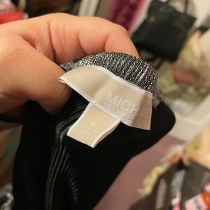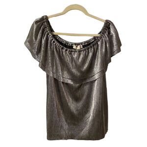 Pre owned like new. Gorgeous silver metallic off the shoulder ruffle blouse. Super stretchy! WOMENS size large.