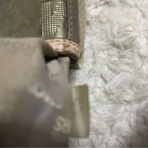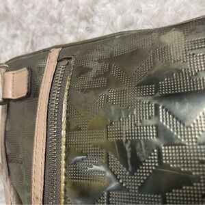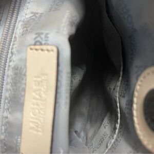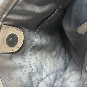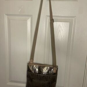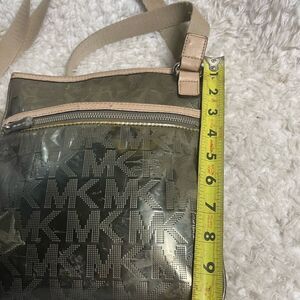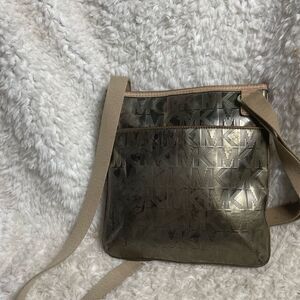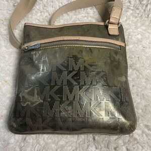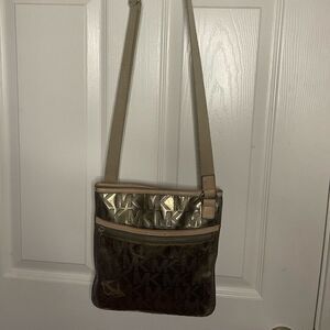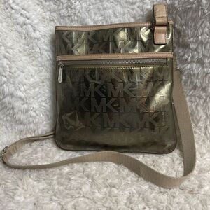 MICHAEL KORS MIRROR METALLIC LOGO metallic gold crossbody bag tan leather trim. Front zipper pocket and front snap closure pocket,back pocket,Top snap closure.the inside lining has a side zipper and a side pocket pre owned in good used condition two small wear on the front of the bag no pealing see all pictures any questions please message.B11