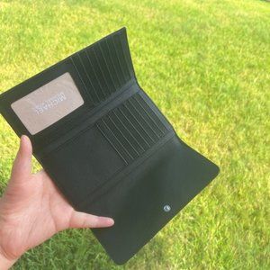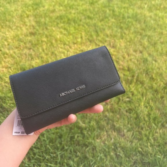 MICHAEL KORS MK JET SET TRAVEL LARGE TRIFOLD WALLET CLUTCH LEATHER BLACK SILVER