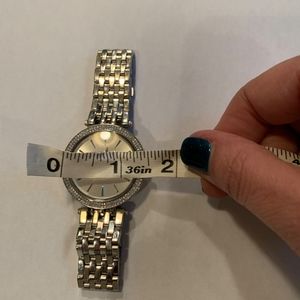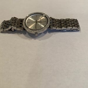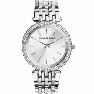 A glistening Darci watch from Michael Kors. Stainless steel case and bracelet. Bezel crystallized with Swarovski elements. Silver dial. Quartz movement. Mineral crystal. Water resistant 50 meters. Case 39mm.