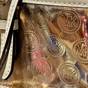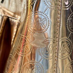 Stunning metallic Michael Kors tote that's perfect for adding glamour to any outfit! This gorgeous bag features the iconic MK logo pattern in shimmering rose gold/bronze tones that catch the light beautifully.