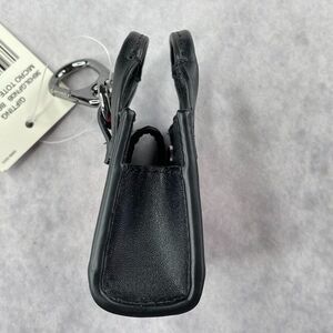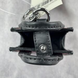 Miniature version of the Signature Logo print tote and is topped with a lanyard clasp. Earbud case, functional charm accent, or utilize it as a keychain.