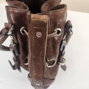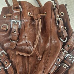 Great handbag purse ! Great condition, see pics. A MICHAEL Michael Kors distressed brown leather handbag with silver tone buckles at the handles and front detailing. The hobo style handbag features the designer’s signature nylon lining with plenty of pockets, an attached clasp for keys, and snap closure.