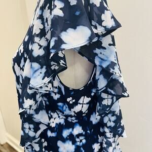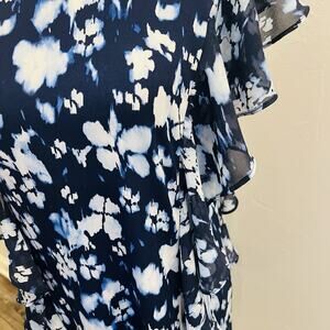 MICHAEL KORS Navy White Floral Print Ruffle Short Sleeve Midi Dress L (A0131)