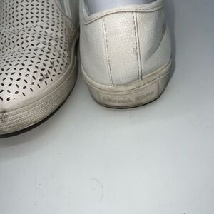 A women’s slip on trainer featuring a perforated upper with a matching white sole and Michael Kors branding.